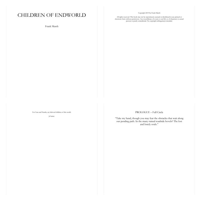 Despite 101 life changes in the last five years I never stopped working on Book Two of The Endworld Series, CHILDREN OF ENDWORLD, and while it took me a bit longer than I expected to finish it, finish it I did, and now, I can officially confirm that not only is CHILDREN done, but it is formatted and one cover short of publication! More info to follow, including a cover reveal and GO LIVE date(s) but for the moment, I can and would love to show you a sampling of what the interior is going to look like, both in print and on Kindle, Nook, iBooks… Whatever your chosen platform. I’ll follow up with everything else in real time.